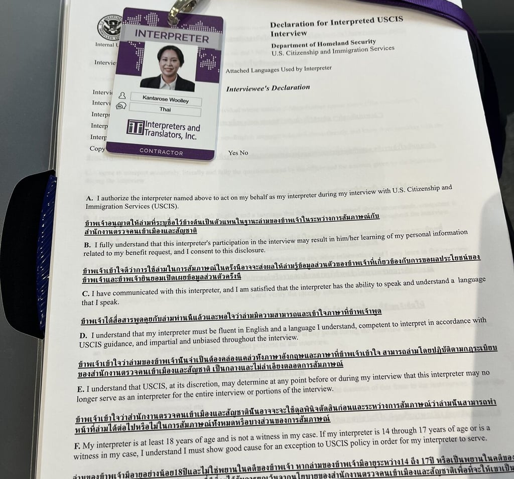 #InterpreterLife hashtag#ThaiInterpreter#USCISInterview #LanguageAccess #ImmigrationSupport #TheLanguageDoctors #ProfessionalInterpreter #MinneapolisInterpreter #AdjustmentOfStatus