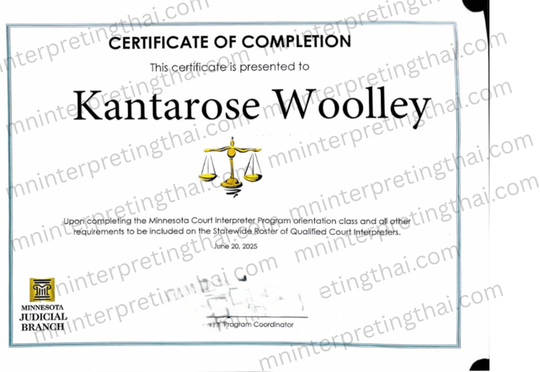 สวัสดีค่ะ ล่ามเบียร์ คันธรส วูลลี่ค่ะ เป็นล่ามประจำอยู่ที่รัฐมินิโซต้า ขึ้นทะเบียนเป็นล่ามศาลคดีอาญา คดีแพ่ง และคดีฝ่ายปกครอง พร้อมให้บริการคนไทยทั่วสหรัฐอเมริกา ไม่ว่าจะเป็นการสัมภาษณ์กรีนการ์ด การสัมภาษณ์อิมมิเกรชั่น ปรับสถานะ แปลงสัญชาติที่สำนักงานUSCIS หรือหากต้องการล่ามทางโทรศัพท์หรือวิดีโอล่ามเบียร์พร้อมให้บริการค่ะ