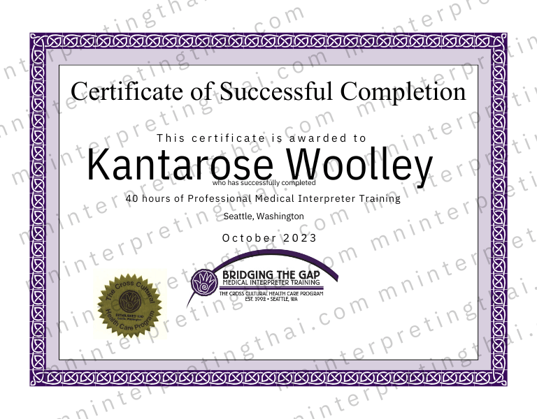 ล่ามมีประสบการณ์เรียนและทำงานที่ประเทศอังกฤษมากกว่า20ปี ใช้ภาษาอังกฤษบริติชเป็นหลัก หลังจากได้ย้ายมาที่อเมริกาก็ได้สอบผ่านรับใบรับรองเป็นล่ามประจำศาลรัฐมินิโซต้า และได้ใบรับรองล่ามทางการแพทย์40ชมจาก CCHCP มีประสบการณ์การล่ามพูดพร้อม (Simultaneous) พูดตาม (Consecutive) ยินดีให้บริการคนไทยทั่วประเทศค่ะ